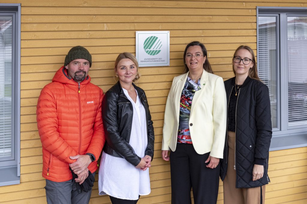 Joutsenmerkki-sertifikaatti kiinnitettiin Perhekuntoutuskeskus Kajon seinään. Kuvassa Esko Sillanpää (Merikratos Oy), Hanna Seppälä (Merikratos Oy), Heidi Karlsson (Teijo-Talot Oy) ja Oona Saarinen (Ympäristömerkintä Suomi Oy).