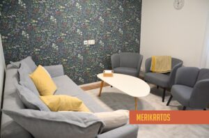 Tilassa on sohva ja kaksi nojatuolia (max. 5 hengelle). Tilassa on terveydenhuollon luvat, eli tila täyttää asiakas- ja potilasturvallisuuden vaatimukset.